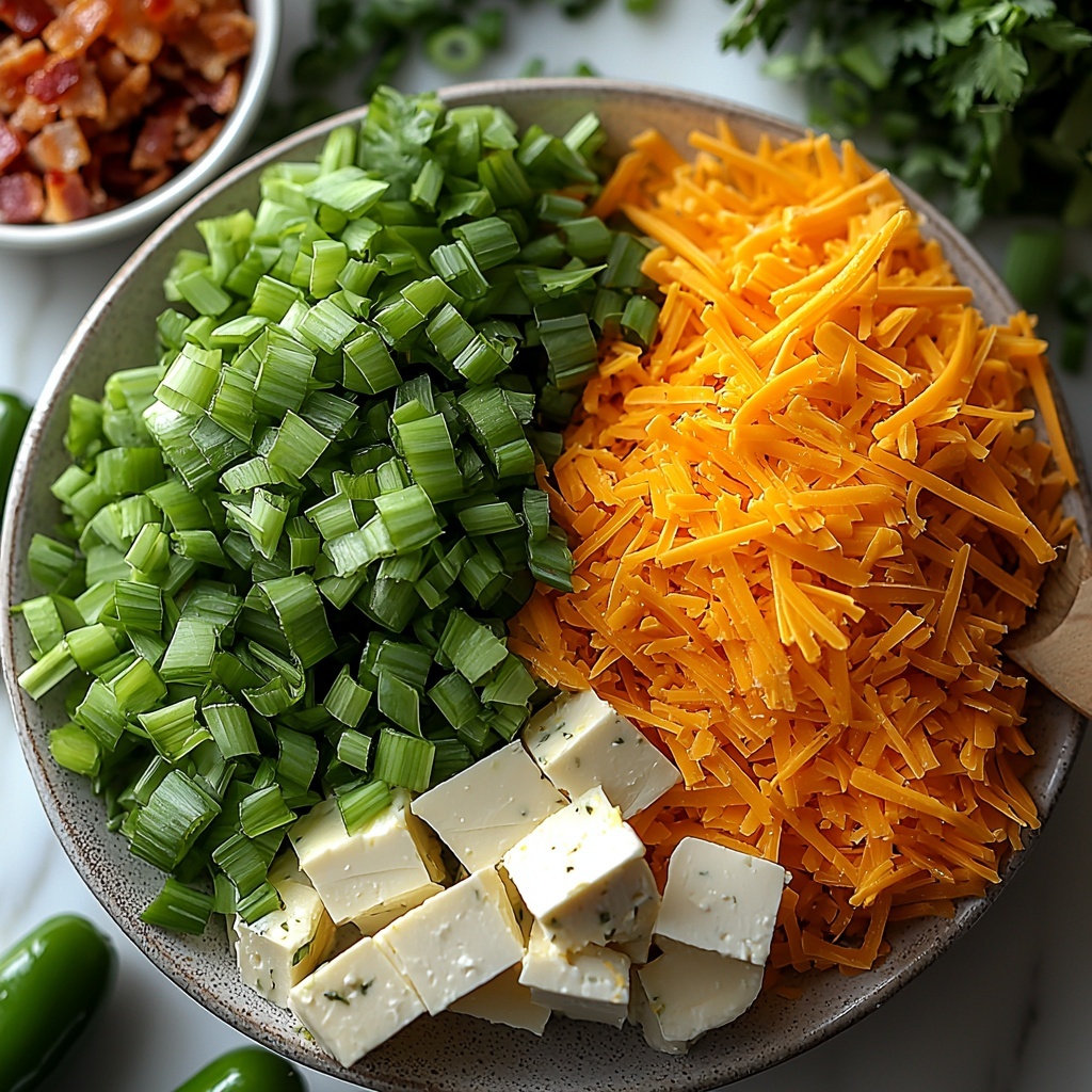 - Make the Cheese Filling: In a large mixing bowl, combine the cream cheese, shredded Colby Jack cheese, shredded cheddar cheese, garlic powder, ranch seasoning, and chopped green onions. Mix thoroughly until well incorporated.