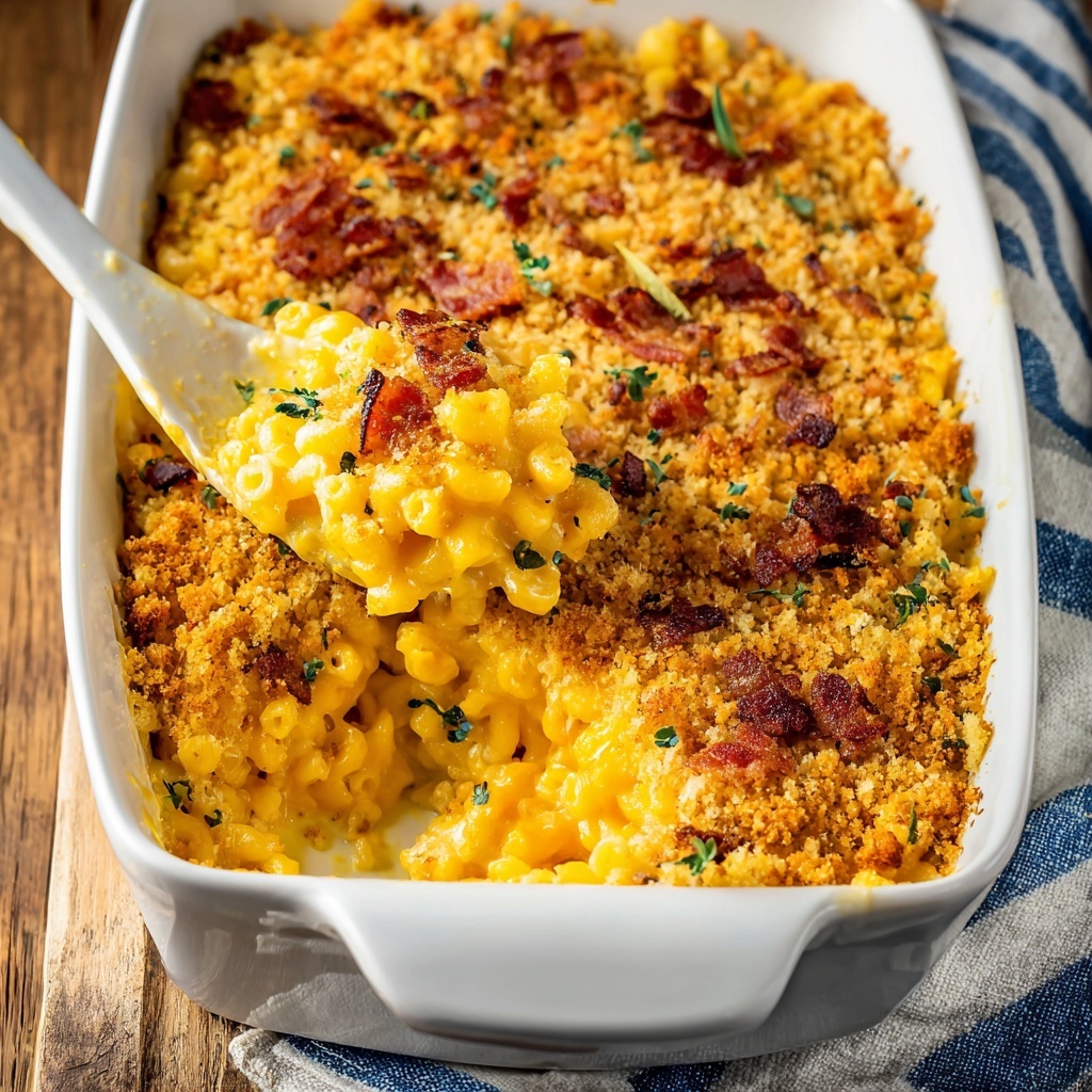 Allow the dish to cool for about 10 minutes so it sets slightly. Before serving, sprinkle the remaining bacon crumbs on top for an extra hit of crispiness and smoky flavor that your guests will love.