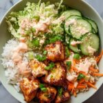 This Bang Bang Chicken Bowl is a vibrant and flavorful dinner option featuring tender, pan-cooked chicken coated in a crispy cornstarch layer, served over fragrant jasmine rice and topped with fresh vegetables and a creamy, spicy Bang Bang Sauce. Easy to prepare and packed with contrasting textures and bold flavors, this dish brings together sweet, spicy, and savory elements perfect for a satisfying weeknight meal.