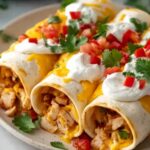 At the center of each tortilla half, spread a spoonful of refried beans, add a generous amount of seasoned chicken, and top it with a sprinkle of shredded cheese. This trio of fillings creates a perfect balance of creamy, savory, and melty textures inside each roll.