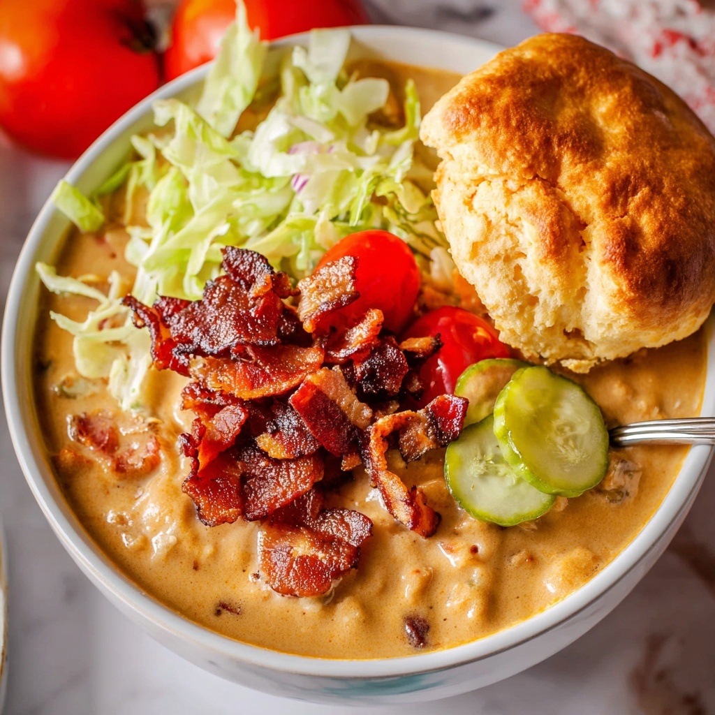 - Serve with Toppings: Ladle the soup into bowls and garnish each with crispy bacon pieces, shredded iceberg lettuce, halved cherry tomatoes, chopped pickles, and a sprinkle of shredded cheddar cheese for that classic cheeseburger experience.
