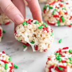 Mini candy canes, red and green M&Ms, crushed peppermint, and holiday-themed sprinkles add great color and flavors. The goal is to add festive crunch and sweetness without overpowering the marshmallow taste.