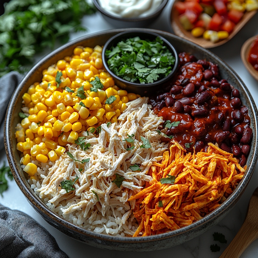 In a large bowl, toss together the cooked rice, shredded chicken, enchilada sauce, diced green chiles, corn kernels, and black beans. Make sure every bite is coated in that luscious sauce for maximum flavor infusion. Mixing everything thoroughly now guarantees even heat distribution and a harmonious taste.