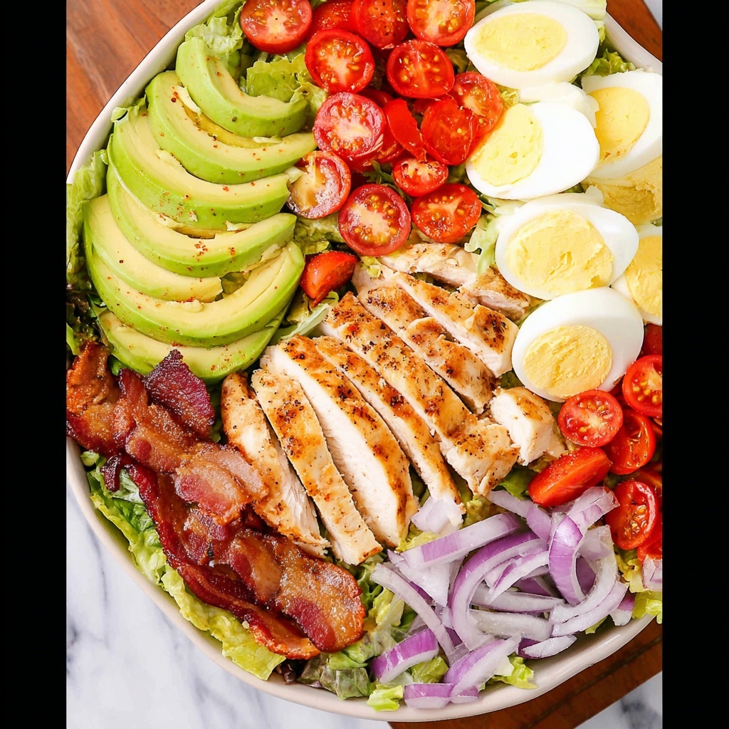 Place the chopped romaine lettuce into your serving bowl as the foundation. Layer on the chicken, bacon, eggs, avocado, cherry tomatoes, and red onion beautifully across the top. Pour your freshly made dressing evenly over the salad and now the fun part—gently toss to combine so every bite gets a perfect coating of that flavorful dressing. Serve immediately and enjoy a fresh and filling meal!