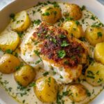 This Creamy Cod and Potato Skillet is a comforting and easy-to-make one-pan dish featuring tender cod fillets cooked atop a bed of thinly sliced, herb-seasoned potatoes. The dish is enriched with a creamy sauce made from chicken broth and heavy cream, accented with garlic, onions, and Parmesan cheese for an added depth of flavor. Perfect for a weeknight dinner, this recipe delivers a harmonious blend of creamy, savory, and fresh notes in every bite.