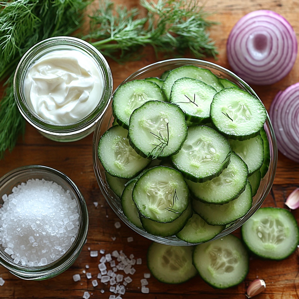 The beauty of this Creamy Cucumber Salad Recipe lies in its simplicity. Each ingredient plays a vital role, from the cool crunch of the cucumbers to the zesty punch of white vinegar, and the smooth richness of sour cream that coats everything perfectly. Having quality, fresh ingredients will make all the difference in the final taste and texture.