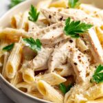 Now, your Crockpot Garlic Parmesan Chicken Pasta – A Deliciously Creamy, Easy Meal Recipe is ready to serve! Scoop generous portions on plates or bowls, then sprinkle with fresh chopped parsley and extra Parmesan for that perfectly polished finish. It’s creamy, cheesy, and utterly irresistible.