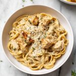 While the sauce is thickening, chop the cooked chicken into bite-sized pieces. This makes it easier to combine with the pasta and ensures every forkful has the perfect balance of chicken and sauce.