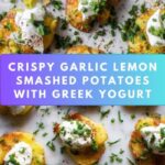 Remove the potatoes from the oven and immediately dollop each with a spoonful of your garlicky Greek yogurt. Sprinkle on the parsley and chives, then add an optional extra drizzle of olive oil for shine and richness. Serve these irresistible Garlic and Lemon Smashed Potatoes Recipe creations piping hot for the best experience.