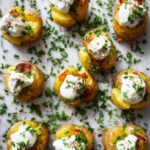 - Serve: Remove the potatoes from the oven. Top each with a dollop of the garlic yogurt mixture, sprinkle with chopped parsley and chives, and add an extra drizzle of olive oil. Serve immediately while hot and crispy.