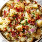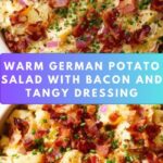 This classic German Potato Salad features tender red potatoes tossed in a tangy, warm dressing made with vinegar, broth, sugar, and mustard, combined with crispy bacon and sautéed onions for a perfect balance of flavors. Served warm and garnished with fresh parsley and chives, it’s a comforting side dish ideal for gatherings and traditional meals.