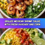 A vibrant and healthy Grilled Mexican Shrimp Salad featuring marinated shrimp grilled to perfection, charred fresh corn, black beans, creamy avocado, and crumbled queso fresco atop a bed of crisp green leaf lettuce. This salad combines smoky, tangy, and fresh flavors, making it a perfect light lunch or dinner option inspired by Mexican cuisine.