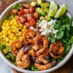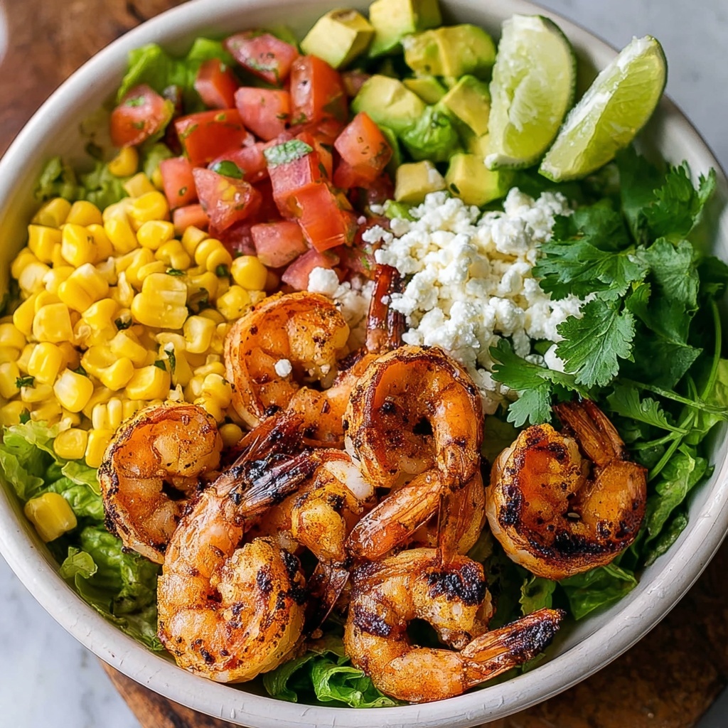 A vibrant and healthy Grilled Mexican Shrimp Salad featuring marinated shrimp grilled to perfection, charred fresh corn, black beans, creamy avocado, and crumbled queso fresco atop a bed of crisp green leaf lettuce. This salad combines smoky, tangy, and fresh flavors, making it a perfect light lunch or dinner option inspired by Mexican cuisine.