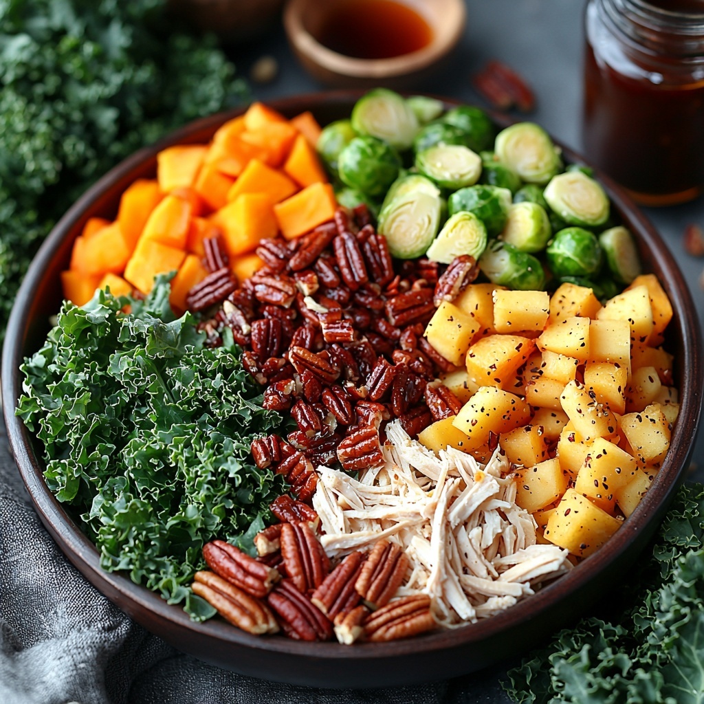 - Assemble the Harvest Bowl: In a large bowl, add chopped kale, cooked wild rice, roasted sweet potatoes and Brussels sprouts, shredded chicken, toasted pecans, diced apple, pumpkin seeds, and crumbled goat cheese. Drizzle generously with the balsamic vinaigrette and toss lightly to combine. Serve immediately and enjoy your nutrient-packed Harvest Bowl!