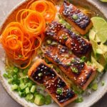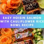 This Hoisin and Sesame Salmon recipe features tender, flavorful salmon broiled with a savory hoisin glaze and topped with toasted sesame seeds. Served alongside fluffy cauliflower rice and a fresh spiralized carrot, avocado, and scallion salad, this dish offers a perfect balance of rich and vibrant flavors in a healthy, quick-to-make bowl.