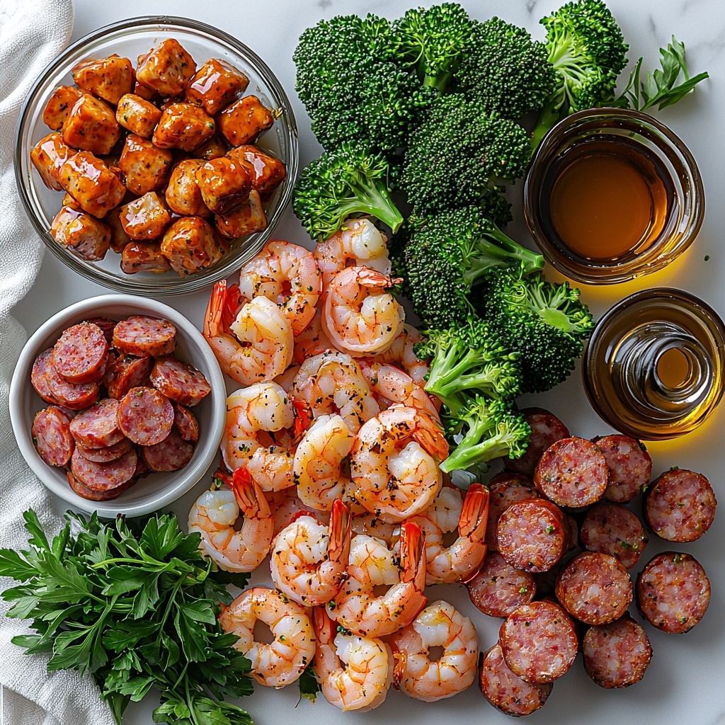 For this Honey Garlic Shrimp, Sausage, and Broccoli Stir-Fry Recipe, the ingredients are refreshingly straightforward but absolutely essential. Each adds a special note—shrimp for succulence, sausage for heartiness, broccoli for crunch, and a honey-garlic combo that ties it all together with a harmonious glaze.