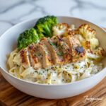 This Indulgent Greek Chicken Alfredo with Crispy Parmesan Broccoli is a rich and creamy pasta dish featuring tender seared chicken breasts, classic fettuccine tossed in a velvety Greek yogurt-enhanced Alfredo sauce, and perfectly roasted broccoli florets topped with crispy Parmesan. Bursting with Mediterranean-inspired herbs like oregano and dill, this comforting meal balances creamy indulgence with nutritious vegetables for a satisfying dinner in just 45 minutes.