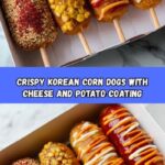 Enjoy irresistibly crispy Korean corn dogs featuring cheese-wrapped beef franks coated in a light yeast batter, that are rolled in tender boiled potato cubes and panko breadcrumbs, then deep-fried to golden perfection. This ultimate snack combines crunchy exteriors with melty cheese centers, perfect for a satisfying treat.