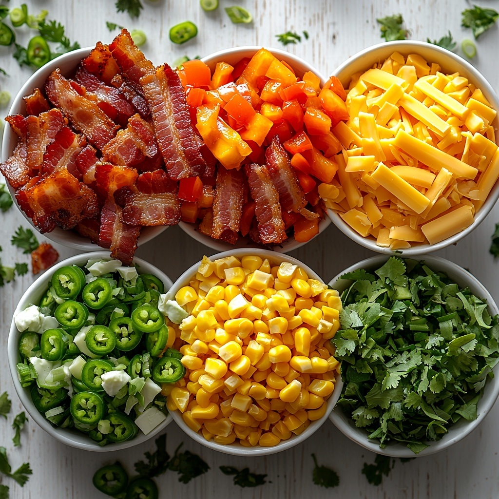 Now, it’s time for the fun part. Stir in the corn, chopped jalapenos, red bell pepper, green onions, sharp cheddar cheese, and most of the crumbled bacon into the creamy base. Mix gently but thoroughly so that every piece is coated with that rich creaminess and the flavors start melding beautifully.