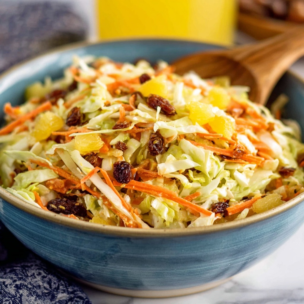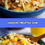 A vibrant and tangy Jamaican Slaw featuring finely shredded cabbage, shredded carrot, sweet pineapple, and raisins, all tossed in a zesty mustard and apple cider vinegar dressing with a hint of jalapeño heat. This refreshing, no-cook salad wilts gently to meld flavors, making it a perfect side dish for Caribbean-inspired meals or summer gatherings.