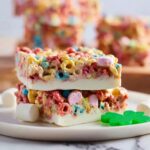 These Lucky Charms Bars are a delightful treat combining melty marshmallows and buttery goodness with the classic Lucky Charms cereal. Enhanced with extra marshmallows on top and an optional white chocolate dip, these chewy bars are perfect for a quick snack or a fun dessert that kids and adults will love alike.