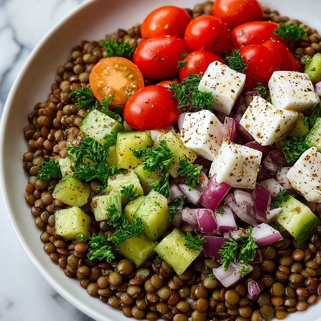 A fresh and healthy Mediterranean Lentil Salad featuring tender lentils mixed with crisp cucumbers, juicy cherry tomatoes, red onion, and fresh parsley, all tossed in a zesty lemon and olive oil dressing. Perfect as a light lunch or nutritious side dish.