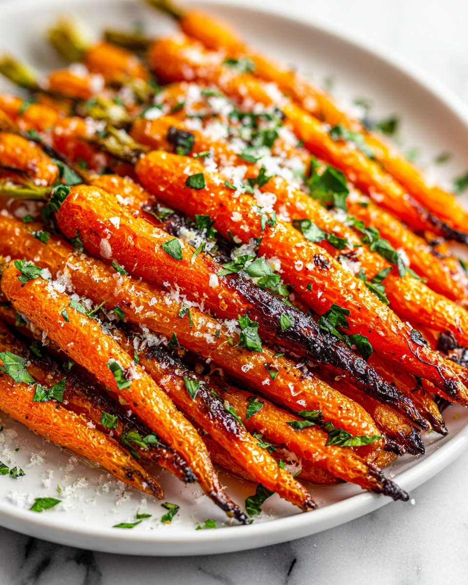 Finish your Parmesan Garlic Roasted Carrots Recipe by sprinkling fresh chopped parsley over the top. This final touch introduces a bright, herbaceous note that balances the rich flavors beautifully and adds a fresh dash of vibrant green to the presentation.