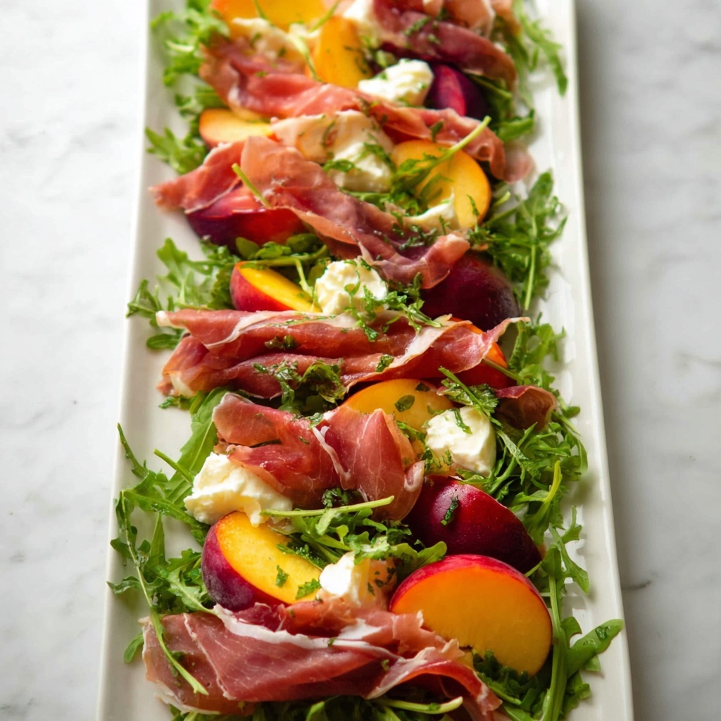 A refreshing and vibrant Peach Salad combining sweet juicy peaches, peppery arugula, creamy mozzarella, and savory prosciutto, all brought together with a tangy Dijon lemon vinaigrette. Perfect as a light lunch or appetizer, this salad balances fresh and savory flavors for a delightful summer dish.