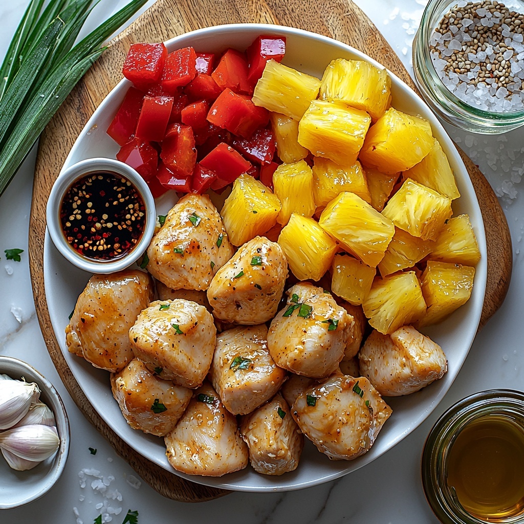 These ingredients are both simple and thoughtfully chosen to bring out a perfect harmony of flavors and textures. Each item plays a crucial role, from the juicy pineapple adding a fresh burst, to the tender chicken thighs keeping things rich and satisfying, and jasmine rice providing a fluffy base that ties everything together.