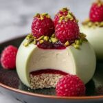 These Pistachio & Raspberry Cheesecake Domes combine creamy pistachio-flavored cheesecake with a tart raspberry center, all encased in a smooth, vibrant green white chocolate glaze. Perfectly portioned and visually stunning, this dessert is ideal for special occasions or elegant gatherings.