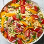 - Combine vegetables and pasta: In a large mixing bowl, add the cooled orzo pasta along with the diced red and yellow bell peppers, halved cherry tomatoes, diced cucumber, finely chopped red onion, and chopped fresh basil.