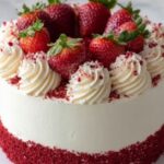 This Red Velvet Strawberry Delight is a luscious layered dessert featuring a moist red velvet cake base, a creamy no-bake cheesecake layer, and a fresh strawberry topping infused with sugar and lemon juice. The dessert is finished with fresh strawberries and whipped cream for a beautiful and delicious presentation, perfect for parties or special occasions.
