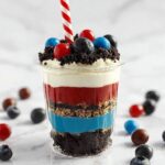 Leftover Red, White and Blue Dirt Cups can be covered with plastic wrap or stored in airtight containers in the refrigerator for up to 3 days. Keeping them chilled helps maintain the pudding’s creamy texture and keeps the Oreo “dirt” from becoming soggy.