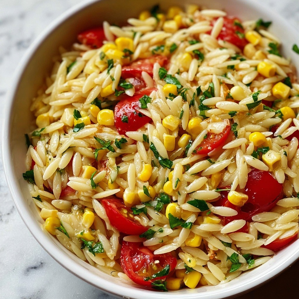 This Roasted Corn Orzo Pasta Salad is a vibrant and refreshing dish combining tender orzo pasta, sweet roasted corn, juicy cherry tomatoes, and fresh basil, all tossed in a tangy olive oil and vinegar dressing. Perfect as a light lunch or a colorful side for summer gatherings, this salad is easy to prepare and delicious served chilled or at room temperature.