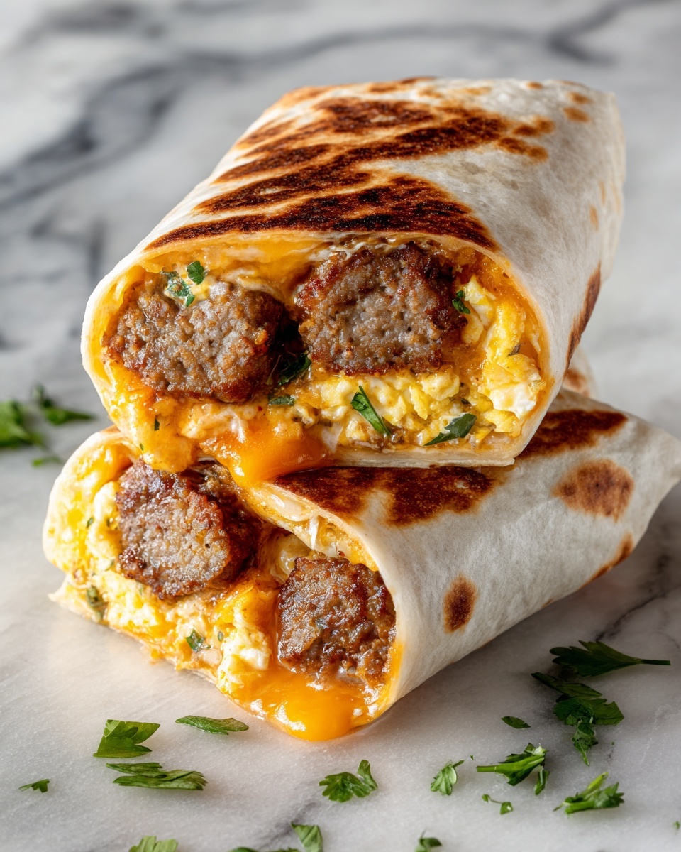 This hearty Sausage Scramble Breakfast Burritos recipe combines savory ground sausage and beef with fluffy scrambled eggs, sautéed vegetables, and melted cheddar cheese, all wrapped in warm flour tortillas. Perfect for a protein-packed breakfast or brunch, these burritos are flavorful, easy to prepare, and customizable to your taste.