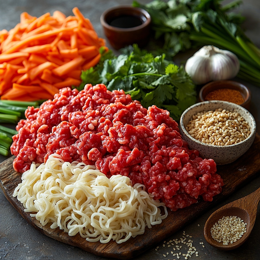 The charm of this Simple Asian Ground Beef Noodles Recipe lies in its straightforward ingredients that bring depth and vibrant colors to your plate. Each element plays a special role, from the tender noodles providing a soft base, to the fragrant garlic and ginger giving it that classic Asian aroma, and the blend of sauces creating a rich, savory coating.
