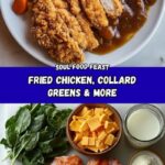 A classic Southern soul food plate featuring crispy fried chicken marinated in buttermilk, tender collard greens simmered in chicken broth, moist and fluffy cornbread, and creamy baked macaroni and cheese. This hearty meal is perfect for a comforting family dinner with bold flavors and satisfying textures.