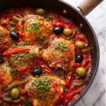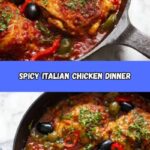 This Spicy Italian Chicken Casserole features crispy skin chicken thighs simmered in a flavorful tomato, wine, and pepper sauce with olives and capers, creating a hearty and aromatic Mediterranean-inspired dish perfect for a comforting dinner.