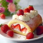 Unroll your cooled cake carefully, then spread the whipped cream evenly over the surface. Scatter your strawberries generously on top. Gently roll it back up, keeping it snug and neat. For a polished look, trim the ends before chilling.
