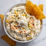 This Street Corn Dip recipe is a flavorful Mexican-inspired appetizer featuring charred corn kernels mixed with creamy mayonnaise and sour cream, spiced with chili powder, smoked paprika, and lime juice, then topped with crumbly cotija cheese, fresh cilantro, jalapeño, and green onions. Perfect for parties or casual snacking, it can be served warm or chilled alongside tortilla chips, crackers, or fresh vegetables.