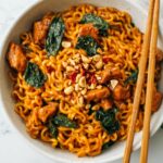 This Sweet & Spicy Hot Chili Chicken Noodles with Basil is a flavorful 45-minute dish combining tender ground chicken with a spicy, tangy sauce infused with fresh basil and ginger. Ramen noodles are coated in the sauce and topped with crunchy roasted nuts and extra red pepper flakes for a satisfying meal with layers of heat and sweetness.