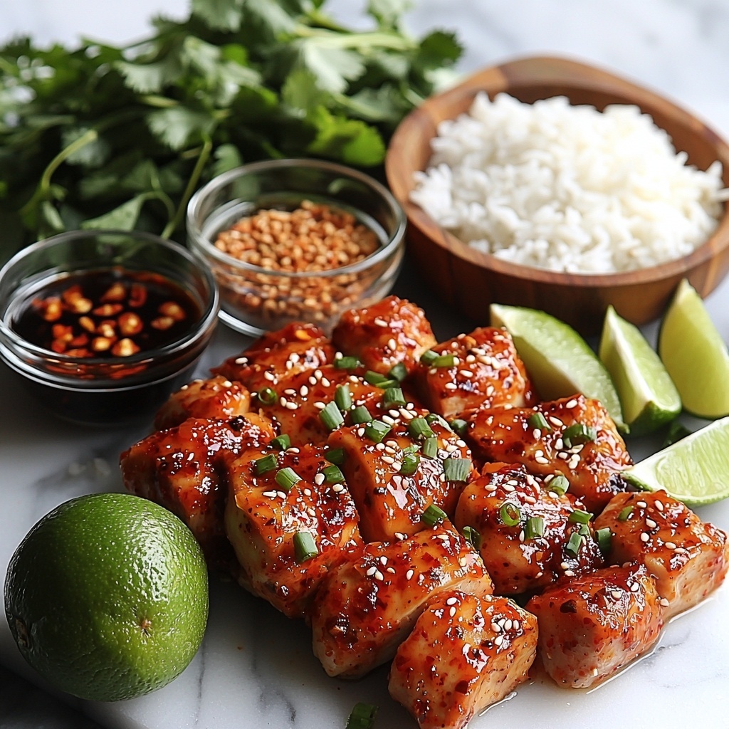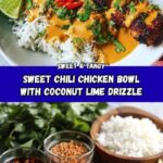 This Sweet Chili Chicken Bowl with Coconut Lime Drizzle combines juicy, caramelized chicken thighs marinated in a flavorful sweet chili and lime sauce, served atop fragrant jasmine rice and finished with a creamy, tangy coconut lime drizzle. Garnished with fresh cilantro and lime wedges, this vibrant dish offers a perfect balance of sweet, savory, and citrusy notes, ideal for a quick and satisfying weeknight meal.