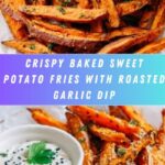Crispy oven-baked sweet potato fries served with a creamy and flavorful roasted garlic tahini yogurt dip. This recipe uses arrowroot powder to create a light, crispy coating on the fries without deep frying, accompanied by a tangy dip made from roasted garlic, tahini, fresh herbs, and non-dairy yogurt for a healthy and delicious snack or side dish.