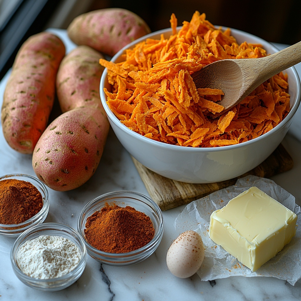 - Make the Batter: In a large bowl, combine the shredded sweet potatoes with the flour, garlic powder, paprika, cumin, salt, and black pepper. Toss everything together until the potatoes are evenly coated. Then, pour in the whisked egg and mix thoroughly until all shredded potatoes are covered.