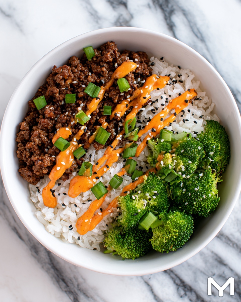 - Serve: Spoon the teriyaki ground beef and broccoli mixture over warmed rice or cauliflower rice. Garnish with toasted sesame seeds and thinly sliced scallions. Serve immediately, with the prepared spicy mayo sauce on the side for added flavor.