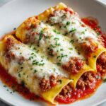 Spread about 1/4 cup of the cheese filling evenly over each lasagna noodle—take your time to cover the surface smoothly. Spoon a generous amount of the beef mixture on top of the cheese layer. Then, gently but tightly roll each noodle from one end to the other, creating beautiful, stuffed bundles that are ready for the oven.