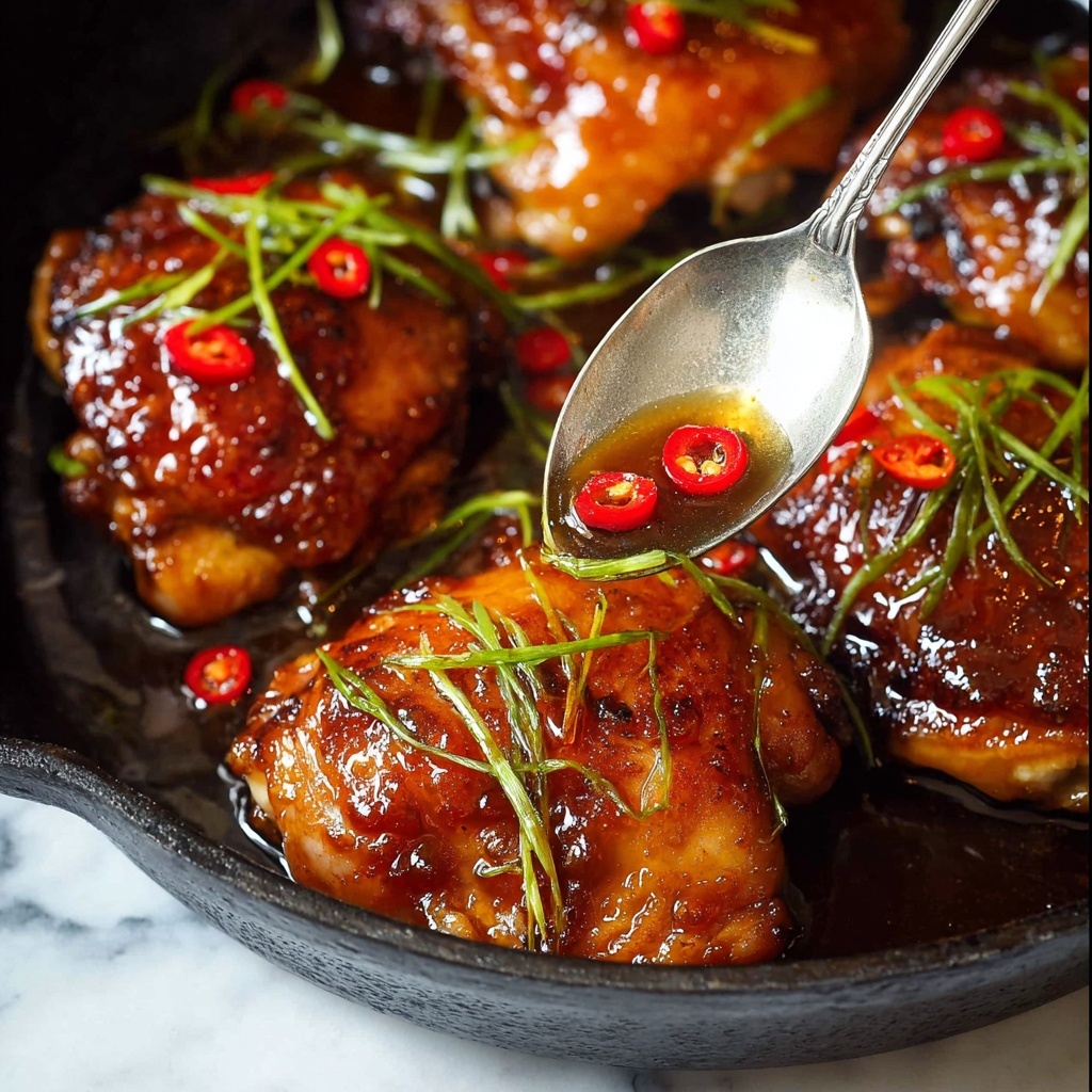 Nestle the chicken thighs into the skillet with the skin side down. This ensures that the skin crisps up beautifully and absorbs those wonderful caramel notes. It’s key to keep the heat just right so the sauce simmers energetically—neither boiling too fiercely nor barely bubbling.
